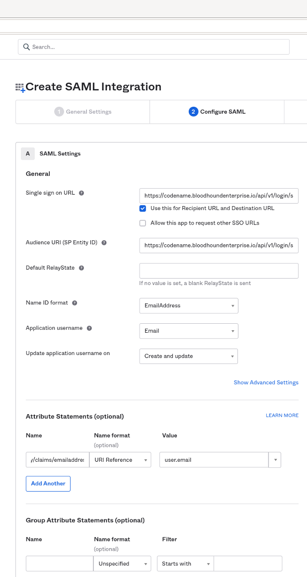 The following SAML settings are required for Okta to integrate with BloodHound Enterprise:| SAML Setting | Value |