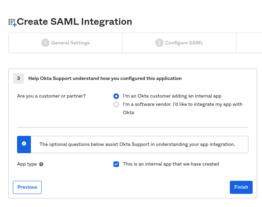 - Once finished, click next to begin setting the SAML configuration for this application.