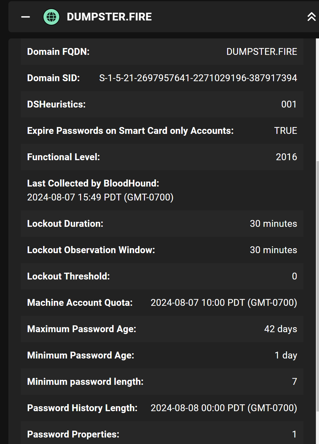 - 22 additional AD properties - (Requires SharpHound v2.5.6+) We’ve added a bunch of new properties to the AD schema, including information around authentication, passwords, and extra domain/trust information with supporting saved queries_._ These new attributes will enable BloodHound users to find additional risks within their environments. The attributes added include: